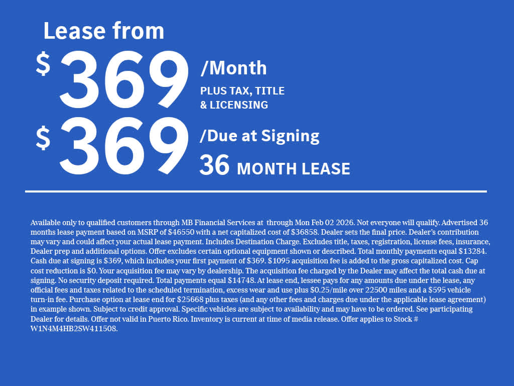 - Radio: Mercedes-Benz User Experience (MBUX) -inc: voice control including natural language understanding and keyword activation (Hey Mercedes), Bluetooth® connectivity, Mercedes me connect services w/trial period, smartphone integration, 10.25" touchscreen multimedia display and 4 USB-C ports (note: adapter will be required to connect to USB-A devices)